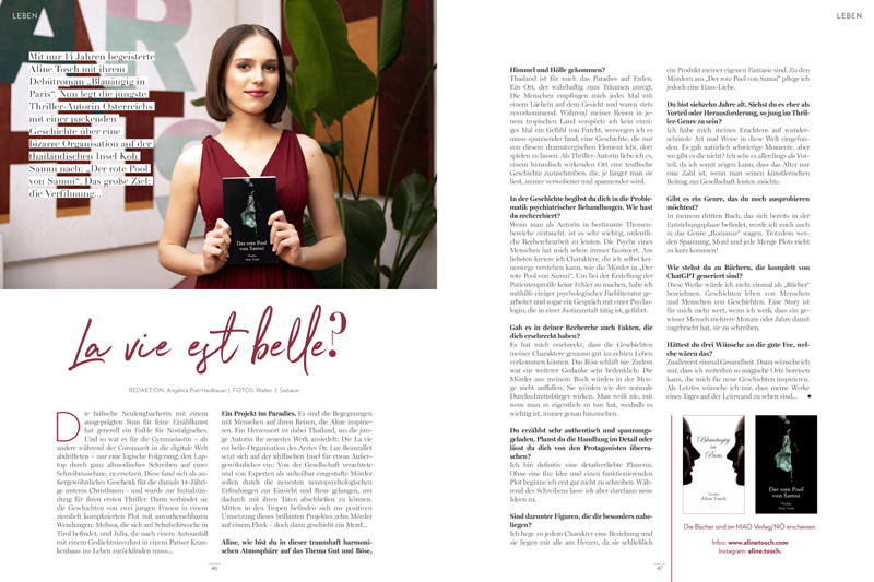 Mit nur 14 Jahren begeisterte Aline Tosch mit ihrem Debütroman „Blauäugig in Paris“. Nun legt die jüngste Thriller-Autorin Österreichs mit einer packenden Geschichte über eine bizarre Organisation auf der thailändischen Insel Koh Samui nach: „Der rote Pool von Samui“. Das große Ziel: die Verfilmung…